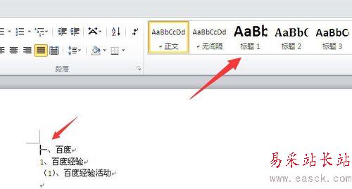 1、首先在自動生成目錄之前,現在word文檔頁面中,把輸入符放在一級標題上面,然后在“開始”菜單下頂部目錄索引框中點擊“標題1”。(如下圖)