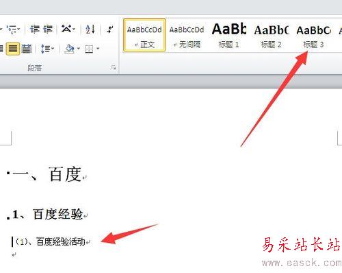 3、然后再把輸入符放到三級標題上面,再用鼠標點擊頂部索引框中的“標題3”。(如下圖)