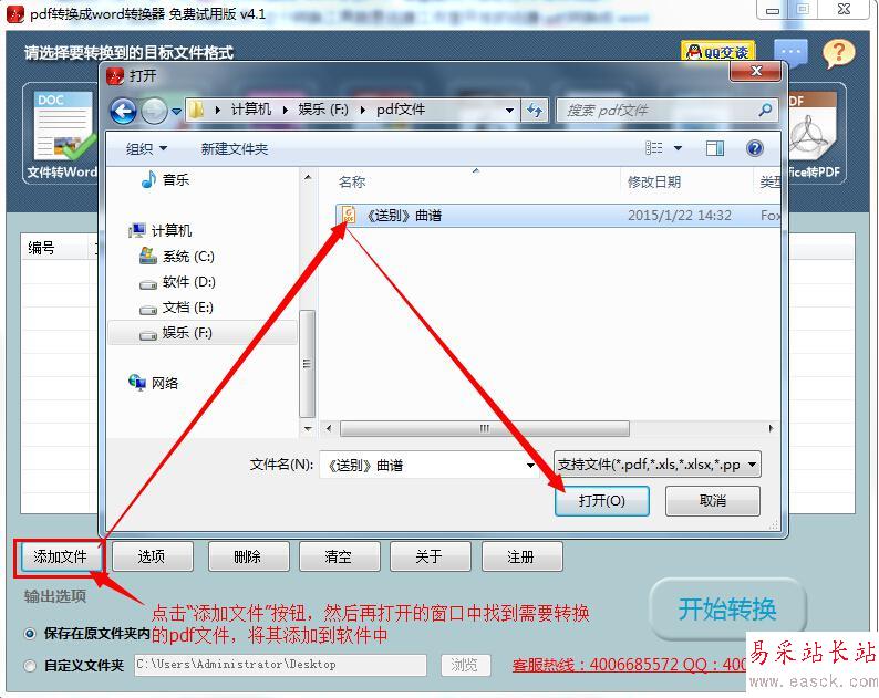 第二步,點擊“添加文件”按鈕,在跳出的窗口中找到要轉(zhuǎn)換的PDF文件,點選后點擊“打開”按鈕將其添加到軟件中。