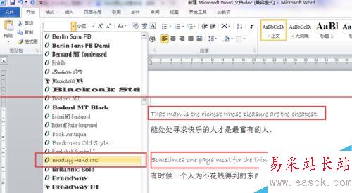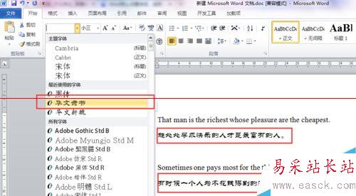 5、這時(shí)我們來(lái)演示一下,全選所有中英文文本,點(diǎn)擊字體,在中文字體中隨意切換,由于Word2010版本有一個(gè)預(yù)覽模式,可以直接在頁(yè)面上看到中文字體的不斷改變,而英文字體沒(méi)有任何變化,不受到影響
