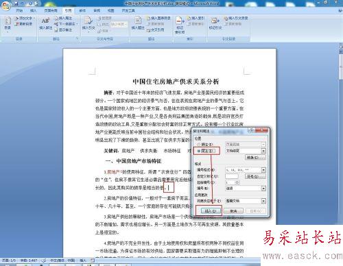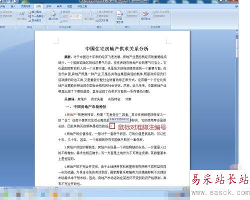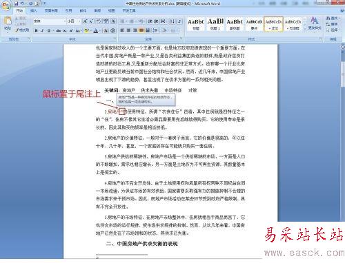 1、首先我們先打開一篇文檔,把光標放在我們需要注釋的字后面。這里我選擇的是房地產三個字。然后引用,在點擊腳注邊上的按鍵,如圖所示。