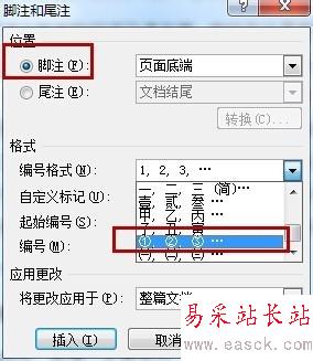 2、在腳注與尾注命令框中,選擇腳注,在編號格式處選擇我們需要的編號格式,一般是選擇帶圈圈的數字。