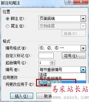 3、再然后我們還要在編號處改為每頁重新編號。(當然這可以根據需要選擇,實際操作)之后點擊插入。