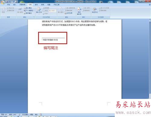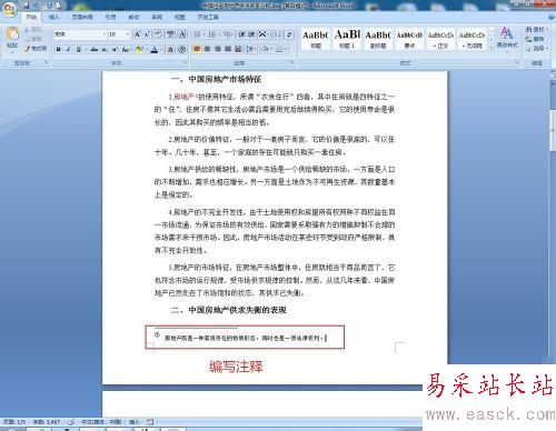 4、然后光標自動跳到該頁的尾端,現在只需把“房地產”我們需要添加的注釋寫入就可以了。這個注釋的字體大小和標號大小是可以調整的。