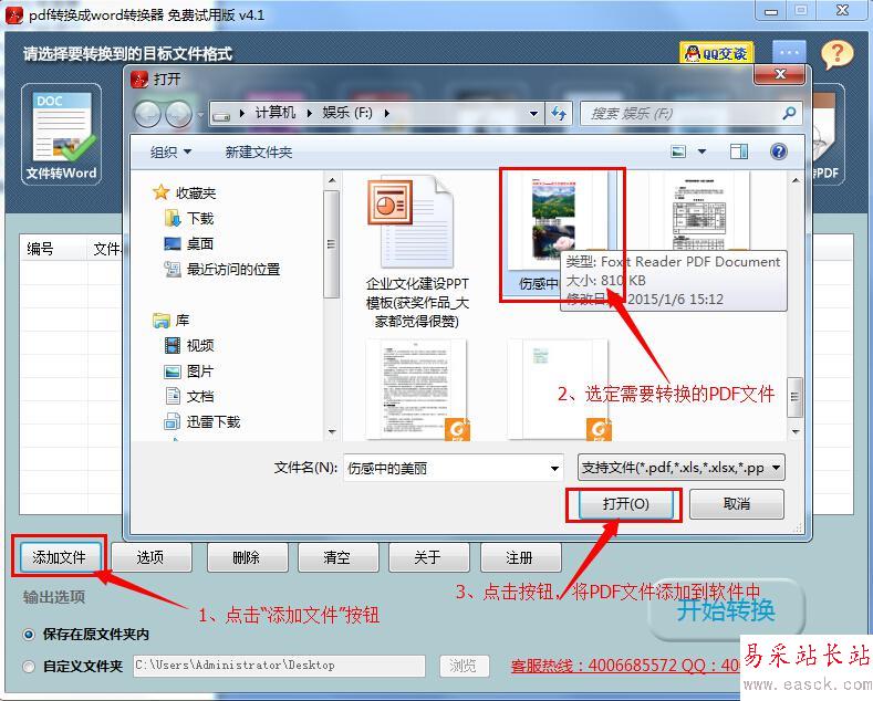 步驟三:點擊“添加文件”按鈕,在跳出的窗口中找到要轉換的PDF文件,點選后點擊“打開”按鈕將其添加到軟件中。