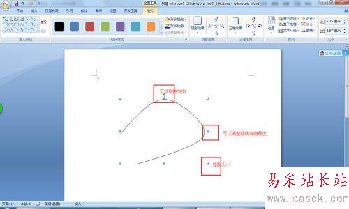 通過調節兩端的控制點,可以改變線段的長度和角度,系統自動切換到形狀格式選項卡,可以設置形狀的顏色,線條的粗細等。我們可以根據下圖的提示來進行調整曲線。