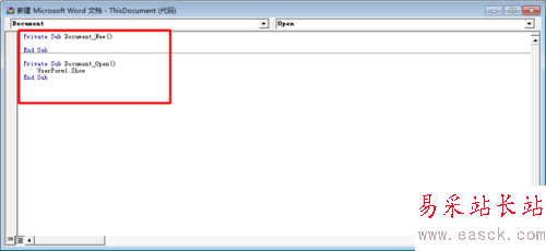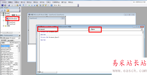 4、廣告窗口制作完成了,那怎么能在打開Word文 檔時自動彈出該窗口呢?在VBA編輯窗口的左側雙擊 "ThisDocument",在右側窗口中選擇Document 下的Open事件。