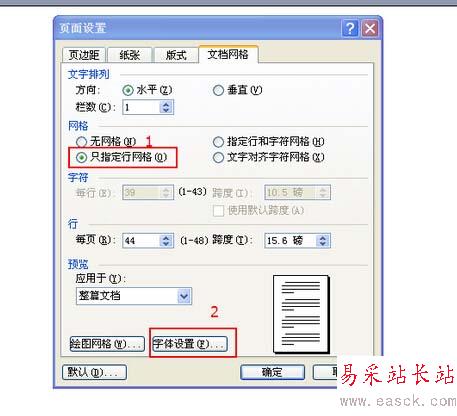 例如,兩篇文檔分別為文檔A和文檔B,現在想以文檔A為標準。打開文檔A,打開菜單文件->頁面設置,切換到文檔網絡,那么文檔B中的此處相應設置應該要一致。接著點擊字體設置,進入字體設置窗口,那么文檔B中的此處相應設置應該也要與此保持一致。如下圖: