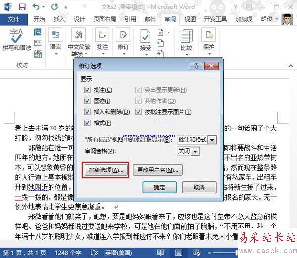 ②這時(shí)彈出修訂選項(xiàng)界面,我們可以自定義設(shè)置需要顯示的內(nèi)容,批注、墨跡、圖片、格式等等,如要進(jìn)行更多的設(shè)置,點(diǎn)擊高級(jí)選項(xiàng)。