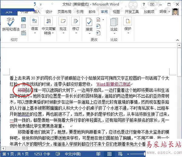④設(shè)置完成,進(jìn)入修訂狀態(tài),例如給第一段加個(gè)文字說(shuō)明,直接輸入即可,輸入之后的文字就是你剛剛設(shè)置的顏色。