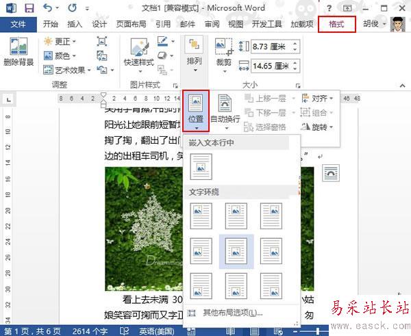 ②彈出插入圖片對(duì)話框,我們打開需要插入的圖片,圖片插入之后,選擇環(huán)繞方式,通過(guò)單擊“格式”--“排列”--“位置”,下方有九種環(huán)繞方式可供我們選擇,這里,我就選取的是居中環(huán)繞。
