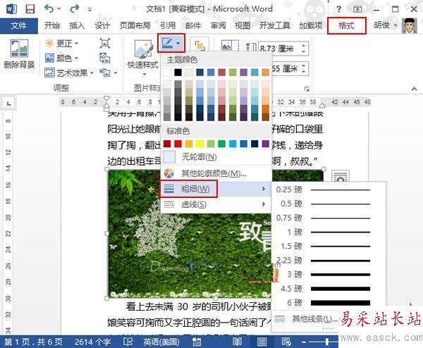 ④如果文字太多,要突出圖片,那么,我建議大家選中圖片,單擊“格式”--“圖片輪廓”--“粗細(xì)”,選擇線條磅數(shù),這樣圖片會(huì)被細(xì)線框起來(lái),更加醒目。