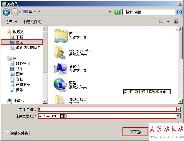 2、此時會彈出一個“另存為”對話框,我們選擇保存圖片的地址和圖片的保存類型,并輸入文件名,然后單擊“保存”按鈕。例如,我們現在將圖片保存在“桌面”中,輸入的文件名為“1”,選擇保存圖片的類型為“ACDSee JPEG圖像”,并單擊“保存”按鈕。