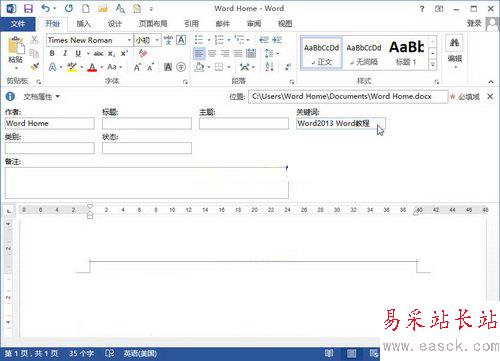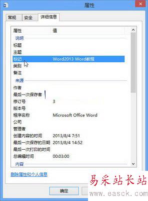 Word Home提示:如果在Windows8系統(tǒng)的計(jì)算機(jī)窗口中通過(guò)右鍵命令查看上述添加了關(guān)鍵詞的Word文檔屬性,則“標(biāo)記”選項(xiàng)即為關(guān)鍵詞,如圖2013080414所示。