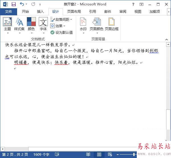 3、當(dāng)然,如果現(xiàn)在我們已經(jīng)不需要水印了,大家可以將其從文檔中刪除。切換到“設(shè)計(jì)”選項(xiàng)卡,執(zhí)行“水印”選項(xiàng)組中的“刪除水印”命令即可。