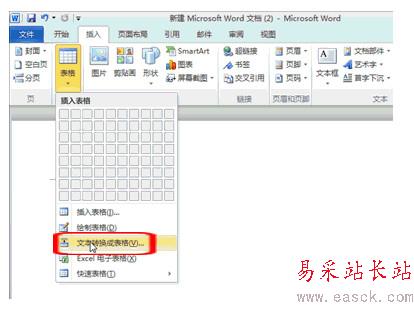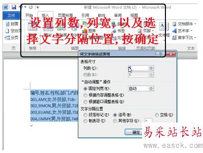 3、點擊“插入 -> 表格 -> 文本轉換成表格”,然后設置列數、行數和文字分隔位置,點擊“確定”按鈕。