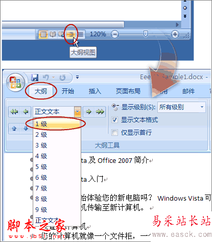 2、光標停在某個第一級標題上,左上角的下拉框拉開,選1級。同樣,光標停在某個第二級標題上,下拉框中選2級。這樣,把整個文檔的結構給標注出來。