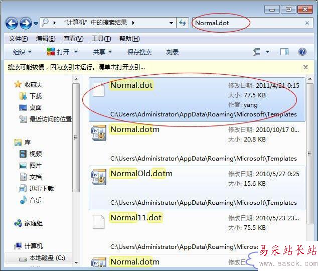 方法一、 雙擊打開“計算機”在右上方的搜索框中輸入“Normal.dot”,此時Win7系統會自動搜尋名稱包含“Normal.dot”這個名稱的文件,搜索的結果可能有很多相似的文件,但你只需要找到“C:/Users/Administrator/AppData/Roaming/Microsoft /Templates”這個路徑下面的“Normal.dot”這個文件,然后將其刪除即可。