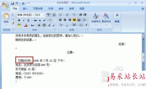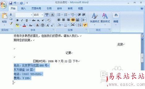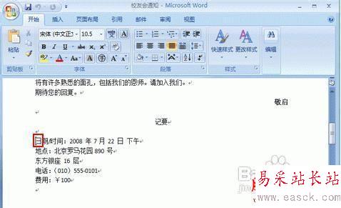 6、單擊“開始”選項卡上的“段落”中的按鈕(“增加縮進量”按鈕)。單擊該按鈕數(shù)次,直到所選文本與要設(shè)置縮進的“日期”行的起始位置對齊。