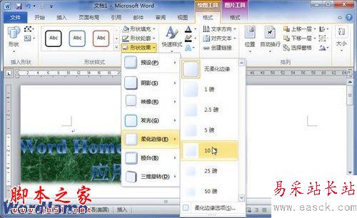 第3步,打開形狀效果菜單,指向“柔化邊緣”選項。在打開的柔化邊緣效果列表中任意一種柔化邊緣效果,則Word2010文檔中的藝術字將實時顯示最終效果。確定使用某一種柔化邊緣效果后單擊該效果即可。