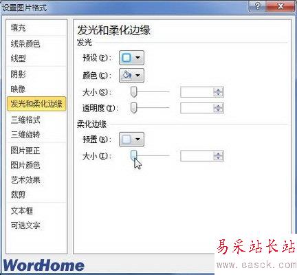 打開“設置圖片格式”對話框,在“發光和柔化邊緣”選項卡中,用戶可以進一步設置柔化邊緣的大小。完成設置后單擊“關閉”按鈕。