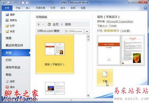 第2步,打開新建文檔窗口,在右窗格中的“Office.com模板”區(qū)域選中其中一種模板類別,然后在預覽區(qū)域單擊“下載”按鈕開始下載。完成下載后將自動新建一個使用該模板的Word文檔,如圖2所示。
