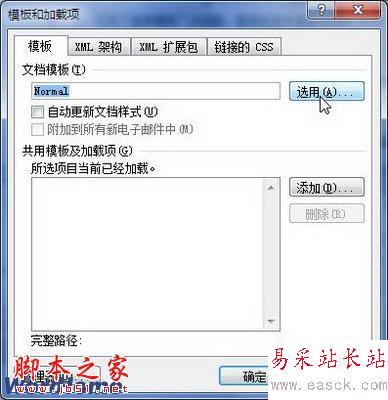 第2步,在打開的“模板和加載項”對話框中切換到“模板”選項卡,在“文檔模板”區域單擊“選用”按鈕,如圖2所示。