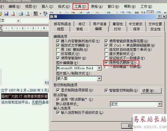 單擊Word“工具→選項”命令,打開“選項”對話框,在“編輯”選項卡中勾選“保持格式跟蹤”復選框即可。