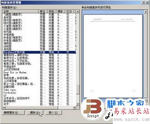 第3步,打開Word 2007“構建基塊管理器”對話框,單擊“刪除”按鈕。在打開的是否確認刪除提示框中單擊“是”按鈕,并單擊“關閉”按鈕即可,如圖所示。