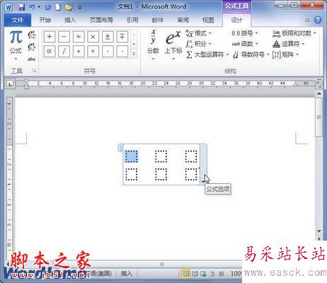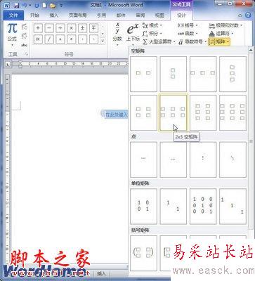 第2步,在Word2010文檔中創建一個空白公式框架,在“公式工具/設計”功能區中,單擊“結構”分組中的“矩陣”按鈕。在打開的矩陣結構列表中包括“空矩陣”、“點”、“單位矩陣”、“括號矩陣”和“稀疏矩陣”等類型,選擇合適的矩陣結構形式,如圖2所示。