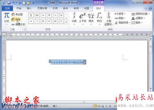 專業型公式布局即使用多行顯示公式結構,以保持數學公式的原貌,從而增加易讀性。線性公式布局則是將公式在單行顯示出來,以方便在Word2010文檔中的排版。用戶可以根據需要在專業型公式和線性公式布局之間進行切換。