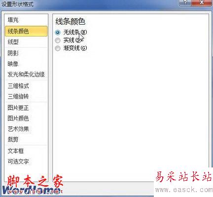 第6步,打開“設置形狀格式”對話框,切換到“線條顏色”選項卡。選中“無線條”單選框,并單擊“關閉”按鈕取消顯示文本框的邊框,從而使文本框和公式融在視覺效果上為一體,如圖2011072806所示。