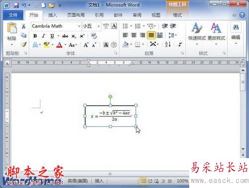 第2步,在Word2010文檔中拖動鼠標左鍵繪制一個文本框,然后單擊公式控制手柄選中公式。在“開始”功能區的“剪貼板”分組中分別單擊“剪切”和“粘貼”命令將公式移動到文本框中。調整文本框大小使其匹配公式大小,如圖2011072802所示。