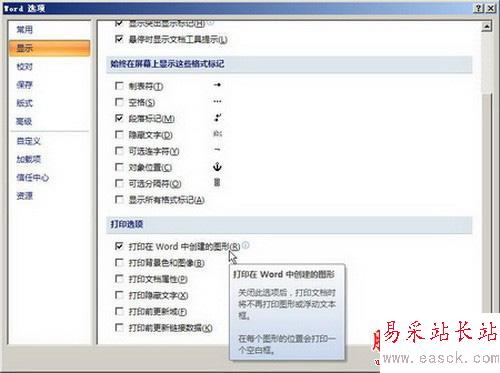 (1)選中Word 2007“打印在Word中創建的圖形”選項,可以打印使用Word繪圖工具創建的圖形;