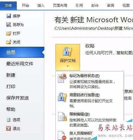 4、點擊Word菜單欄的“文檔”→“信息”→“保護文檔”