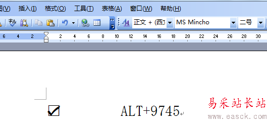 方法二:可以在word2003中按住ALT鍵,再在右邊的小鍵盤區輸入“9745”幾個數字,再松開ALT鍵,文檔中就會出現方框中打勾的符號。