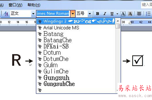 方法四:先在Word中輸入“R”(必須是大寫),然后選中“R”,再選字體“Wingdings 2”,而我們輸入的“R”就會變成方框里打鉤的符號:
