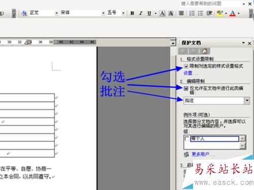 4、勾選第1(格式設置限制)和第2(編輯限制)項,在第2項的下拉菜單中選 “批注”。