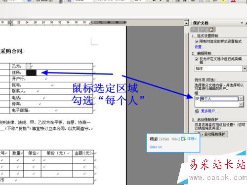 6、舉一反三,選定所有不需要保護的內容,然后勾選右側的“每個人”,一般情況下是空白部分。完成之后如圖所示