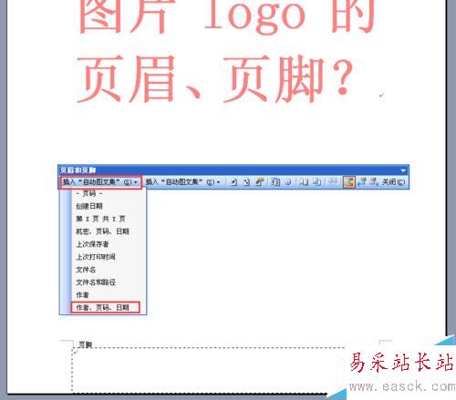 8、接下來就是做頁腳了。鼠標在頁腳輸入處點下。再點擊【頁眉和頁腳】工具條的【插入“自動圖文集”】,彈出一個下拉條,選擇【作者、頁碼、日期】。