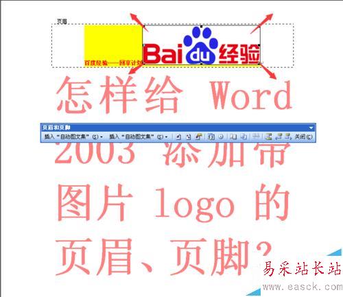 6、圖片插入到頁眉的位置后,進行大小調整。選中圖片后,可以直接拉動四個角的其中一個進行調整。