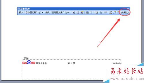 10、按照頁眉插入圖片的方法,給頁腳插入圖片、調整文字。點擊工具條完成按鈕即可。