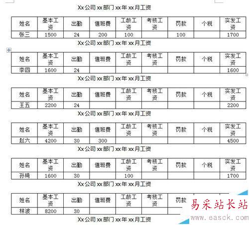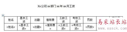 2、根據Excel工資表的內容在Word中創建一個如下圖所示的基本工資條。