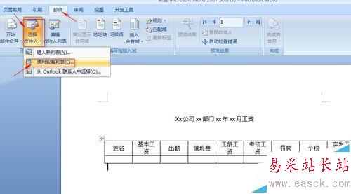 3、選擇“郵件”-“開始郵件合并”-“選擇收件人”-“使用現有列表”命令。