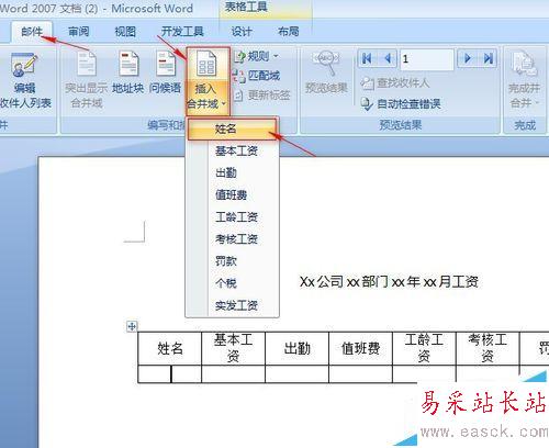 6、將光標定位到“姓名”下面的單元格中,單擊“郵件”-“編寫和插入域”-“插入合并域”的下拉按鈕,在彈出的下拉框中選擇對應的域,即“姓名”。按照這種方法為其他空白的單元格插入相對應的域。完成后效果如下: