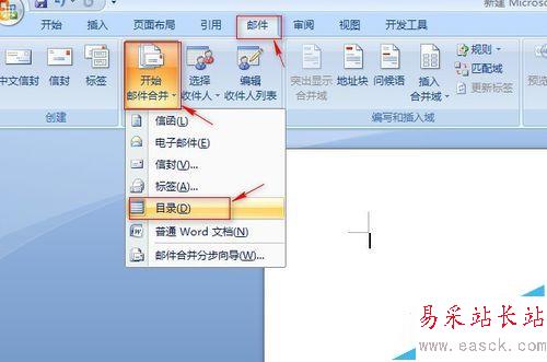 1、新建一個Word文檔,選擇“郵件”-“開始郵件合并”-“目錄”命令。