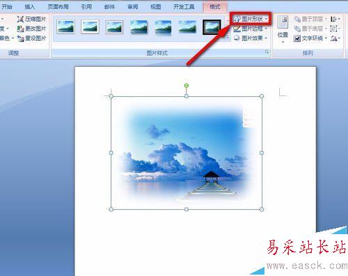 7、找到菜單欄上的“圖片形狀”的選項,如下圖所標示的地方,點擊進行。