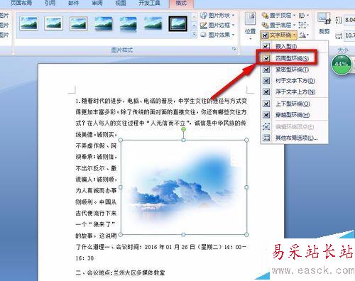 10、點擊菜單欄上的“文字環繞”選項,然后在彈出來的選項框內找到我們所需要的環繞方法,如下圖所示: