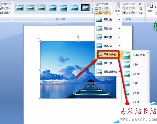 5、點擊“圖片效果”之后,我們找到下方的“柔化邊緣”選項,在彈出來的選項里跟具情況選擇需要柔化的大小數值,我以柔化50磅為例。如下圖所示: