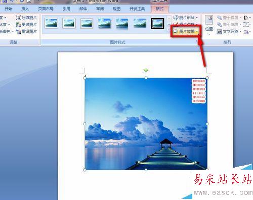 4、現在我們就看到圖片已經插入到我們的頁面里了,這時候我們的菜單欄下方的選項欄里有一個“圖片效果”的選項,點擊。如下圖所示: